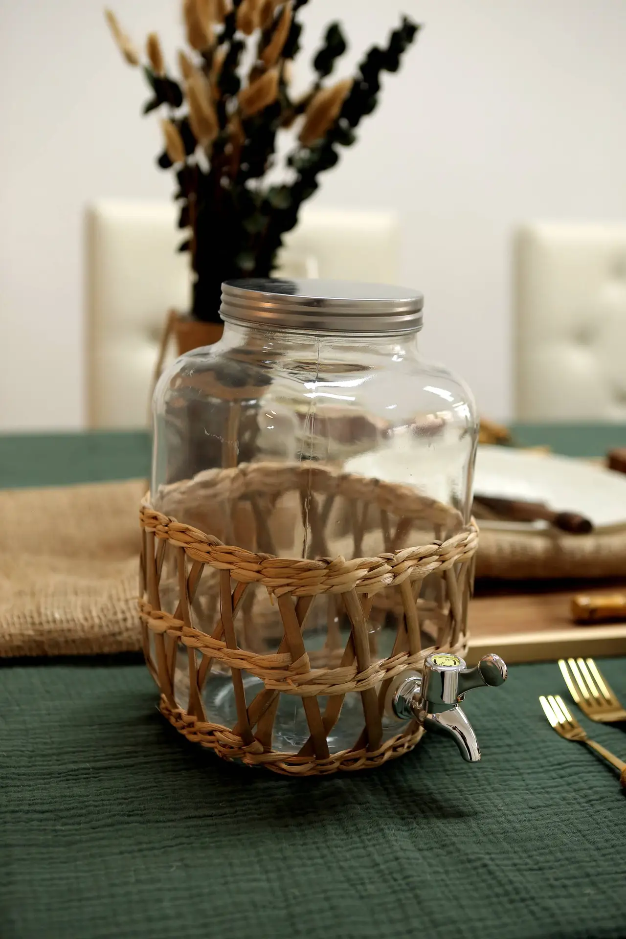 Glass drink dispenser wrapped in natural wicker — perfect for infused water, lemonade or iced tea.