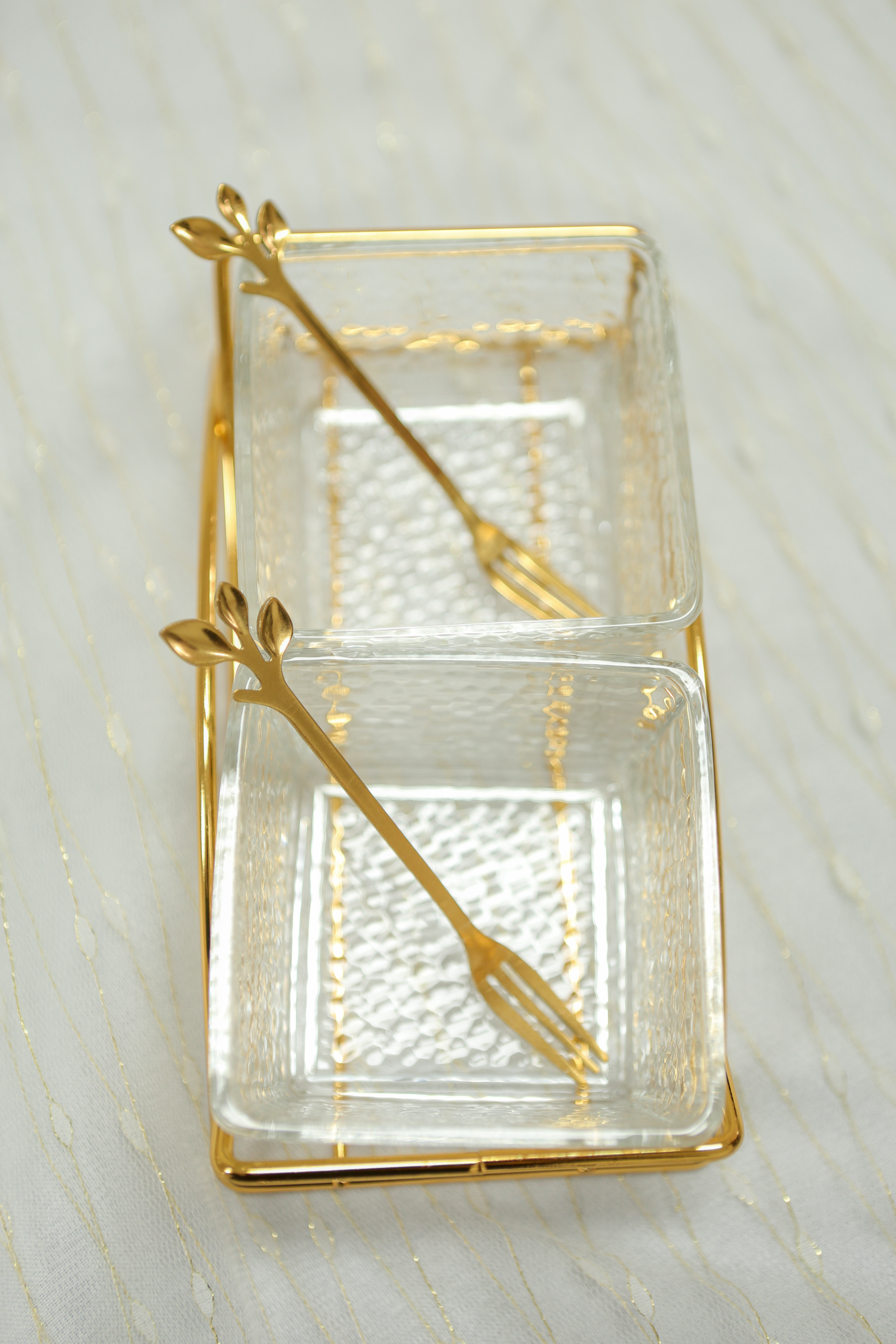 Clear hammered dip dishes with gold mini forks — ideal for olives, sauces or tasting bites.