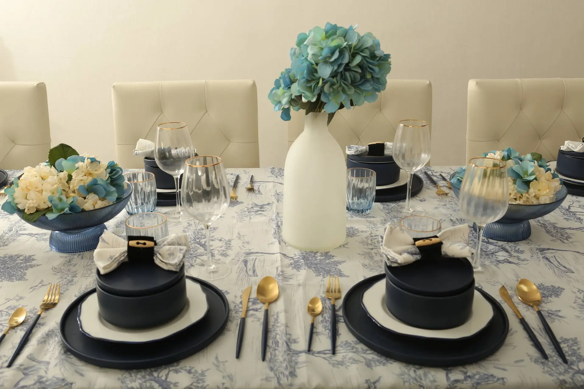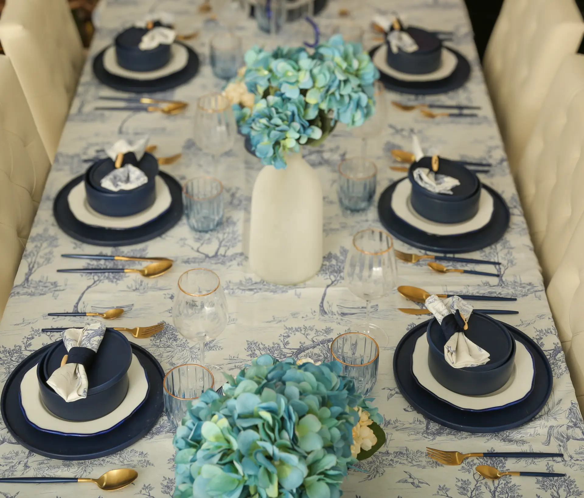 This PartyBox features a classic blue-and-white toile tablecloth paired with fine stoneware dinnerware and charming covered crocks — a detail that adds warmth and dimension to each place setting. Clear and blue glassware, gold accents, and soft floral décor complete the refined, layered look.