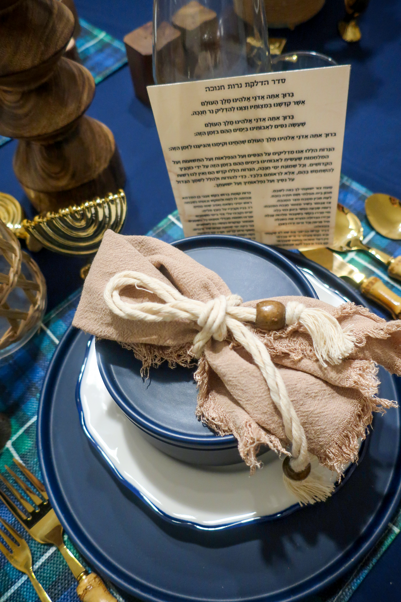 Thoughtful layering — from the plaid placemats to the textured napkins and elegant place settings — creates a look that works beautifully for hosting, family meals, and special.